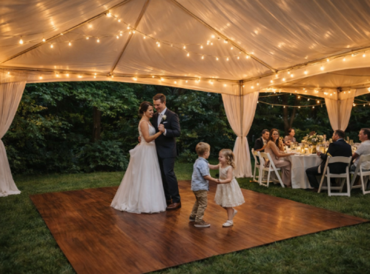 Anchor your event space with the warmth and elegance of our Cherry Wood Plank Dance Floor. Featuring a rich, reddish-brown wood grain finish, this floor provides a stunning contrast against white tents. The 15' x 15' size is our most popular wedding choice, offering a perfect balance of space and intimacy for the average reception.